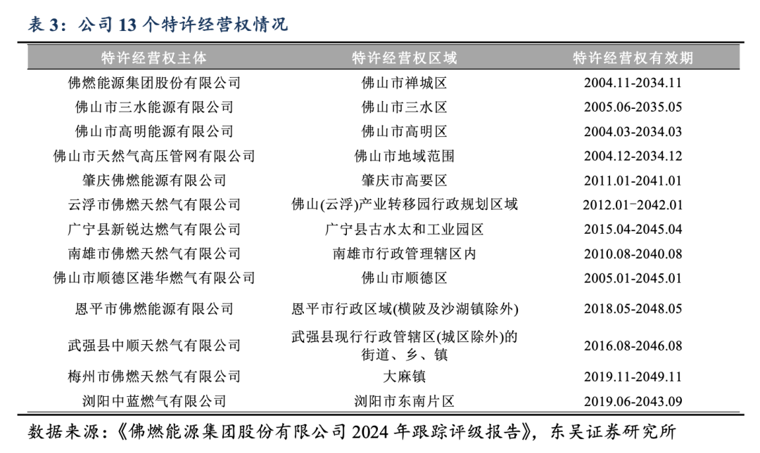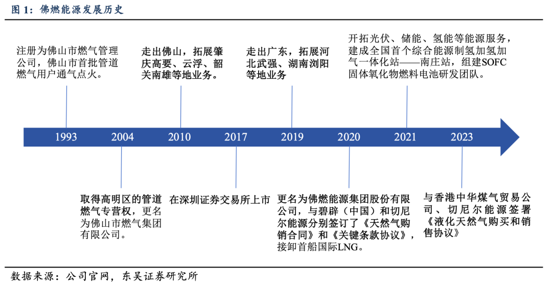 扩展城燃业务范围,深化综合能源服务企业定位。1993年2月26日,佛山市燃气管理公司注册成立;同年7月,佛山市首批管道燃气用户通气点火。2004年,公司取得高明区的管道燃气独家特许经营权,更名为佛山市燃气集团有限公司。2010年,公司将城燃业务扩展至佛山市外,取得肇庆高要、云浮、韶关南雄等多个地区的燃气专营权,2019年进一步扩张至河北武强、湖南浏阳等地,获得共13个区域的燃气专营权。2020年3月,公司更名为佛燃能源集团股份有限公司,明确综合能源服务企业定位,深耕城燃业务的同时协同推进光伏、储能、氢能等能源服务;同年,通过子公司香港华源与国际油气行业领先的供应商碧辟(中国)和切尼尔能源达成共识,签订天然气购销合同,丰富气源结构,保障稳定供应,接卸首船国际LNG。2021年,公司建成全国首个综合能源制氢加氢加气一体化站——南庄站,开始组建SOFC固体氧化物燃料电池研发团队,开拓管道检测、窑炉热工装备制造等科技研发与装备制造业务。2023年,公司与切尼尔能源签署《液化天然气购买和销售协议》,预计2028年以后每年从切尼尔采购86万吨LNG,提升公司应对市场资源波动时的抗风险能力。佛燃能源坚持以“能源+ 科技+ 供应链”为发展方向,深耕城市燃气,同时积极推进石油化工产品、氢能、热能、光伏、储能等能源服务,持续拓展SOFC固体氧化物燃料电池、氢能装备制造研发等科技研发与装备制造业务,大宗商品资源、物流、仓储等一揽子供应链业务以及延伸业务,实现业务的多点布局。
