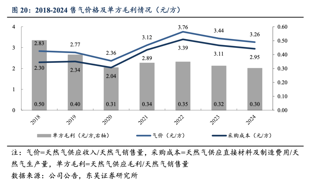气价回落,单方毛利保持稳定。居民用户管道天然气价格执行当地政府定价政策,工商业用户用气价格实行最高限价管理,具体销售价格由供需双方在不超过最高限价内协商制定。公司非居民用户天然气销售价格制定采取与上游采购价格联动的机制,但佛山市政府统筹兼顾天然气行业上下游、企业发展和民生保障的情况下,采取了同步同向非全额传导涨价因素的方式确定非居民用户天然气销售价格。近年来,受全球能源结构调整、减排目标逐步推进等影响,天然气供需失衡;加之爆发俄乌冲突等因素,国际天然气价格波动较大;2020年起公司气价/采购成本攀升,2022年受到国际冲突影响气价达到近年最高值后回落。2020-2024年,单方毛利较为稳定,稳定在0.30-0.35元/方。