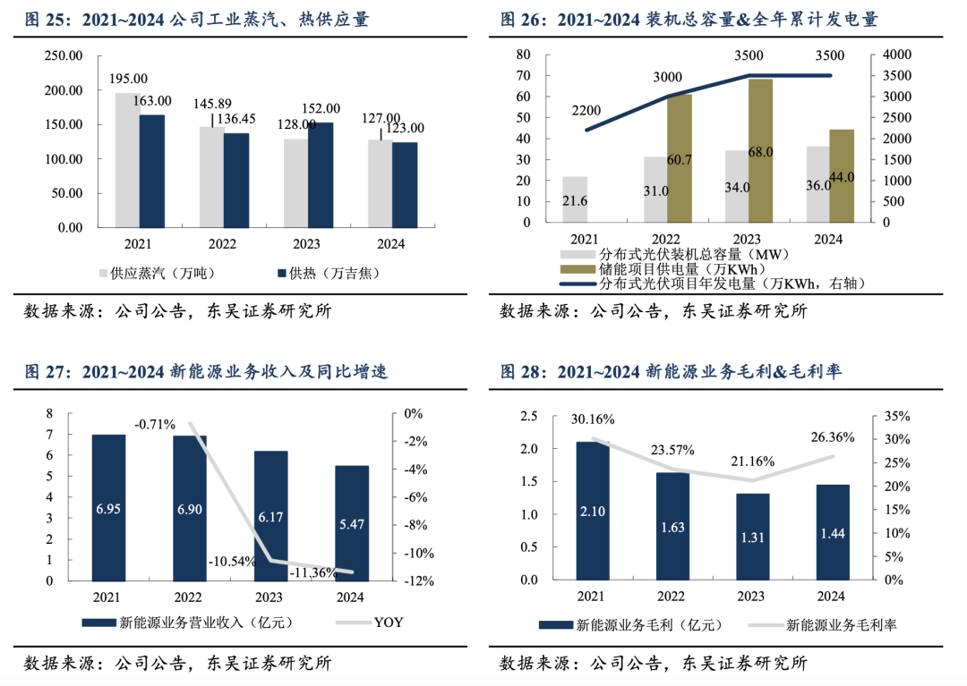 多元布局新能源业务,包括冷热能、光伏储能等领域。1)冷热能业务方面,针对公共服务行业,提供能源托管、供热与供冷改造等服务,以“电厂余热为主、备用燃气锅炉为辅”开展集中供热,同步推进蒸汽支线管网建设,扩大覆盖范围。2024年向客户供应集中工业蒸汽约 127 万吨,供热约 123 万吉焦。2)分布式能源业务方面,为工商业用户提供热、电、冷一体化能源供应服务,投资建设三水水都分布式能源站项目,助力基地集中供热并降低用能成本。3)在光伏及储能业务上,依托燃气业务区域优势,推进分布式光伏发电,于2024年投资建设2个分布式光伏发电站,总容量约2.5MW。截至2024年末,公司累计持有30余个光伏项目,装机容量突破36MW;2024年全年累计发电量约为3500万kWh。2024年公司储能项目向客户供应电能约44万kWh。