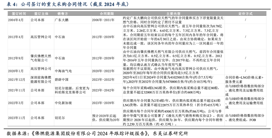 建立集资源采购、接收、储运、销售一体化的天然气业务模式。公司燃气业务在佛山市内具有专营优势,同时在佛山市外开拓多处管道燃气特许经营权。截至2024 年底,公司累计获得13 个区域的管道燃气特许经营权。2024年天然气供应营业收入为146.68亿元,同比下降6.6%,主要系量价齐跌,天然气销售量同比下降1.5%至44.99亿方,同时供需关系缓解气价回落。2024年天然气供应业务毛利13.57亿元,毛利率达9.25%,保持稳定。公司分别拥有广东珠海金湾液化天然气有限公司11%股权和广东大鹏液化天然气有限公司2.5%股权,取得了良好的LNG 接收站项目投资收益,并通过签署接收站使用协议,获取LNG 气化加工权益。公司建立了集资源采购、接收、储运、销售一体化的天然气业务模式。