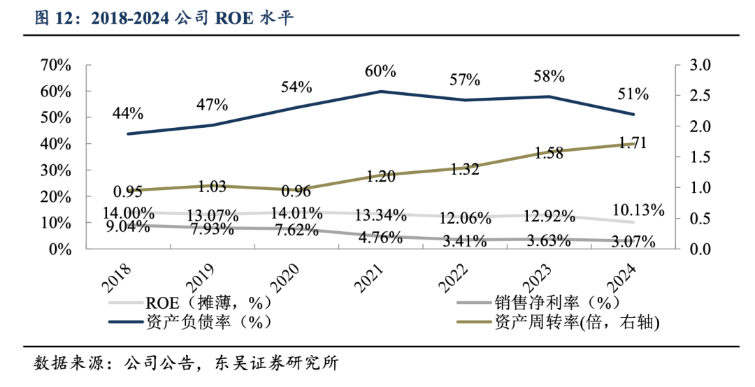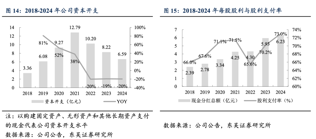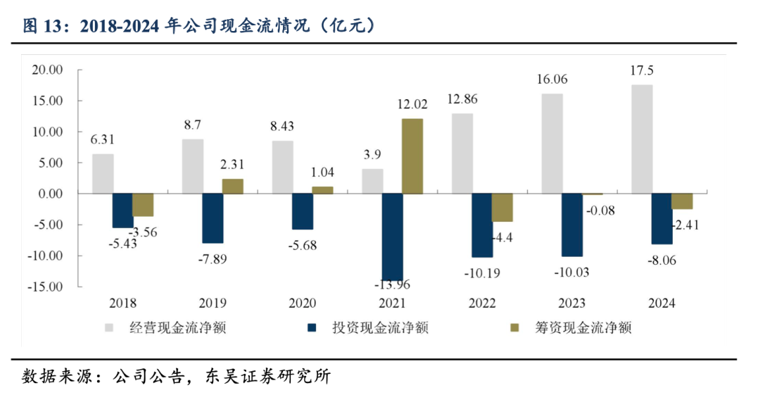 经营活动现金流充裕,分红稳步提升。2018-2024年公司经营活动现金流充足,2024年经营性现金流为17.50亿元,远超资本开支;良好的现金流为公司的日常运营、战略布局、技术研发等关键领域的资本开支提供有力支撑。2021年公司筹资现金流同比增加1067.72%,主要系公司收到增加长期借款、增发中期票据和发行永续债等筹资款项。2024年公司筹资活动现金流为-2.41亿元,主要系公司规划融资进度及规模,降低利率水平,偿还债务支付的现金同比增加较大。公司坚持稳健且积极的分红政策,2024年公司现金分红总额为6.23亿元,同比增加5.06%,股利支付率为73.0%,同比上升2.8pct。