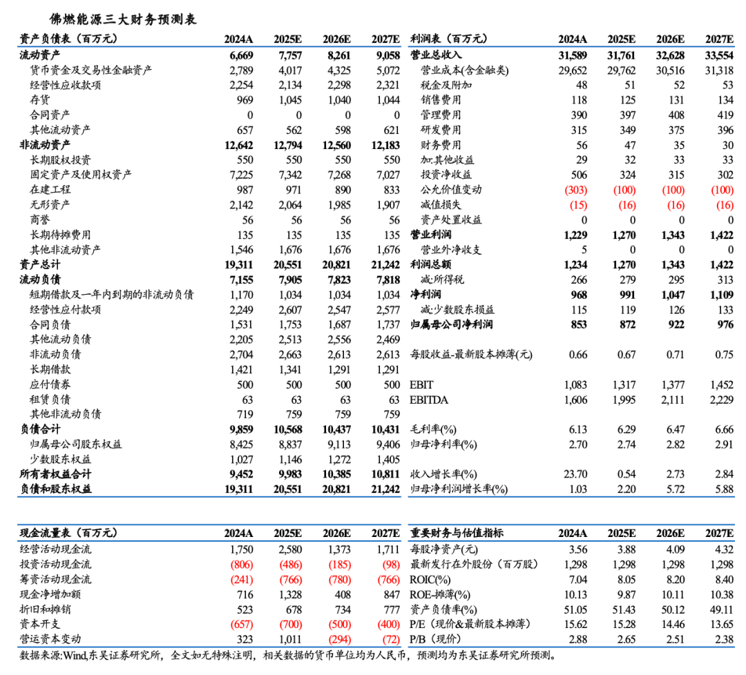 ]article_adlist-->佛山城燃龙头,向综合能源服务企业转型;实施股权激励计划,现金分红稳定提升。公司统一接收所有进入佛山市地域范围内的管道天然气,为佛山市城燃龙头。截至2025年3月,佛山国资委为公司实控人;全国城燃龙头港华燃气为第二大股东,通过技术赋能、资源整合等多种方式与公司进行合作,助力公司向综合能源服务企业转型。公司积极实施股权激励计划,2020-2024年均超额完成目标。公司股权激励考核指标包括营收增长率、每股收益、每股分红及现金分红比例,2020-2024年均超额完成。2020-2024年公司分红比例均值超70%,假设2025年维持2024年73%的分红比例,对应股息率4.8%(2025/6/11)。 城燃等能源业务:气源多元,政策推动气量/光伏装机规模高增。1)天然气供应:气源供应渠道多元,政策目标2025-2035天然气消费量复增8.9%。公司燃气业务在佛山市内具有专营优势,同时在佛山市外开拓多处管道燃气特许经营权。截至2024 年底,公司累计获得13 个区域的管道燃气特许经营权。2018-2024年公司天然气销售量复增17.59%,2024年达到45亿方;用户结构保持稳定,工商业/电厂/居民用户气量占比约80%/15%/5%。依照佛山市能源规划目标,2025-2035整体/气电天然气消费量复增8.9%/8.5%。公司拓展国际资源,与碧辟(中国)、切尼尔能源、中化新加坡等跨国能源企业建立长期采购关系;我们估算2028年公司海外长协将达109万吨(约16亿方),资源保障能力将大幅提升。2)新能源业务:多元布局,政策锚定2025-2030年分布式光伏装机规模复增10.8%。公司布局冷热能、光伏储能等新能源业务。政策提到,到2025/2030年,佛山市光伏装机规模达到360/600万千瓦,锚定2025-2030年分布式光伏装机规模10.8%的复合增速。 供应链、延伸、科技研发与装备制造业务多点开花。1)供应链业务:发挥产业链优势,营收高速增长。公司深耕能源供应领域,协同石化仓储、码头、运输等优势资源为客户提供供应链服务。2024年公司生物柴油、保税燃料油进出口业务量近10万吨;等值油品和化工品销售量191.88 万吨,同增67.35%。2)延伸业务:工程服务与生活服务并行,毛利率高。公司开展燃气管道设计等服务,同时依托深耕佛山30年的品牌形象,提供安全智能家居服务。2021年起,延伸业务营收稳定在5亿元左右;毛利率维持在25%以上。3)科技研发与装备制造业务:加强校企合作,驱动科技创新。业务涉及SOFC 固体氧化物燃料电池、窑炉热工装备制造与节能减排、管道检测、氢能装备制造研发。 盈利预测与投资评级:我们预计 2025-2027 年公司归母净利润为8.72/9.22/9.76亿元,同比+2.2%/+5.7%/+5.9%,对应PE15.3/14.5/13.7倍(估值日期2025/6/11)。公司天然气供应业务持续稳定发展,新能源业务稳步增长,供应链、延伸、科技研发与装备制造业务多点开花。首次覆盖,给予“买入”评级。 风险提示:经济增速不及预期,极端天气 & 国际局势变化,安全经营风险,商誉减值风险 |