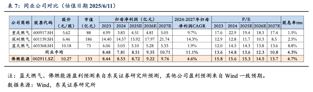 我们预计2025-2027年公司归母净利润为8.72/9.22/9.76亿元,同比+2.2%/+5.7%/+5.9%,对应PE15.3/14.5/13.7倍(估值日期2025/6/11)。我们选取同为地方城燃龙头的重庆燃气、深圳燃气、蓝天燃气做对比;与同业公司均值相比公司估值略高,但公司维持更高的分红比例使得股息率高于同行均值。公司天然气供应业务持续稳定发展,政策目标佛山市2025-2035天然气消费量复增8.9%;新能源业务稳步增长,政策锚定2025-2030年佛山市分布式光伏装机规模复增10.8%;供应链、延伸、科技研发与装备制造业务多点开花。首次覆盖,给予“买入”评级。