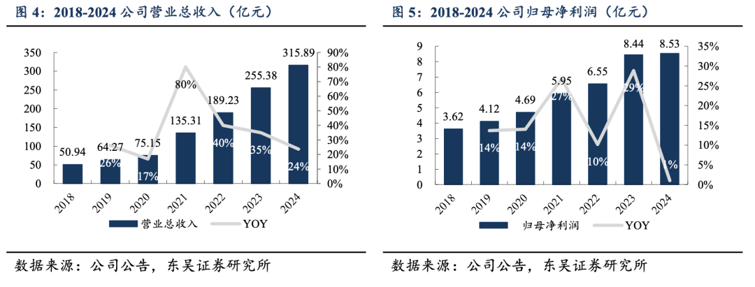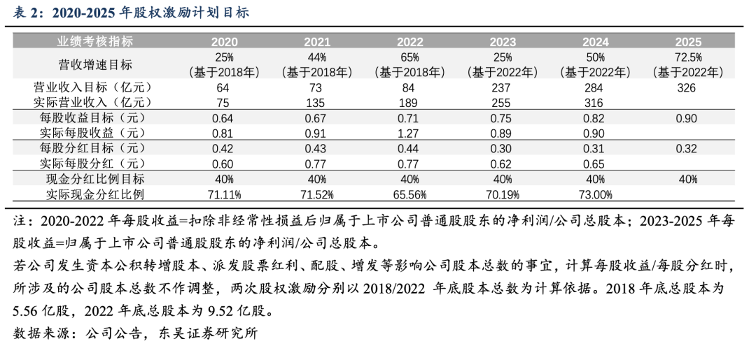 实施股权激励计划,超额完成激励目标。2019年,公司推出股票期权激励计划,拟向激励对象授予不超过1688万股股票期权,约占公司当时股本总额的3%;要求2020-2022 年公司营业收入增长率以2018年为基数,分别不低于25%、44%、65%;每股收益分别不低于0.64元/股、0.67元/股、0.71元/股;每股分红分别不低于0.42元、0.43元、0.44元;现金分红比例均不低于40%;以上目标均已超额完成。2023年,公司再次推出限制性股票激励计划,拟向合计125名激励对象授予不超过3072.50万股限制性股票,约占当时公司股本总额的3.22%;要求2023-2025 年公司营业收入增长率以2022年为基数,分别不低于25%、50%、72.5%;每股收益分别不低于0.75元/股、0.82元/股、0.90元/股;每股分红分别不低于0.30元、0.31元、0.32元;现金分红比例均不低于40%。截至2024年,目标均已超额完成。