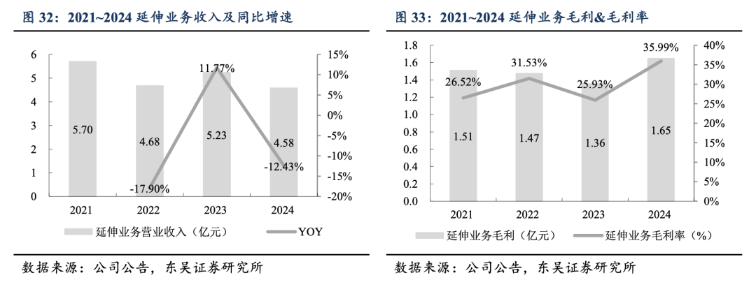 经营稳定,毛利率保持较高水平。2021年起,延伸业务营业收入整体稳定在5亿元左右;毛利率维持在25%以上,盈利能力优秀。