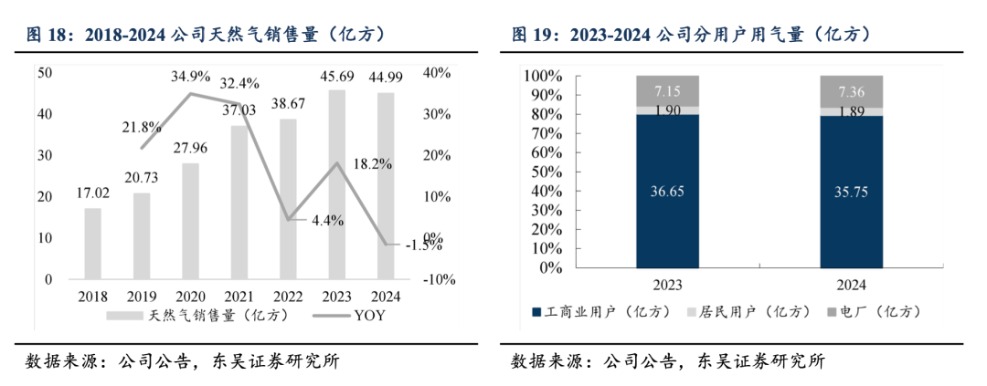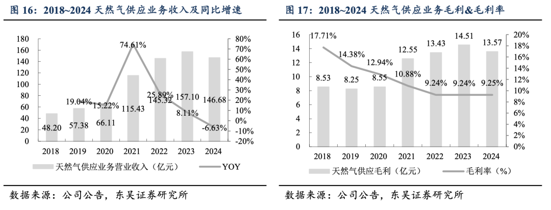 2018-2024年天然气销售量复合增速达17.59%,用户结构保持稳定。2018-2024年公司天然气销售量复合增速17.59%,2024年销气量44.99亿方,同比下降1.5%。自2018年以来,总体用户结构较为稳定,公司天然气供应业务主要面向工商业用户、居民用户以及电厂,工商业用户气量占比约80%、电厂气量占比约15%、居民气量占比约5%。2024年工商业用户销气量35.75亿方,同比下降2.45%,主要受宏观经济影响用户需求不振;居民用户销气量1.89亿方,同比下降0.6%,主要系2024年冬季偏暖,采暖需求较弱所致;电厂销气量7.36亿方,同比增长2.87%。