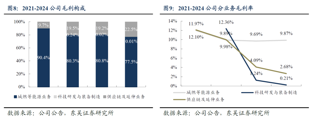 从分业务毛利率来看,城燃等业务毛利率稳定在10%左右;供应链业务毛利率较低系大宗商品贸易本身的低附加值、低毛利率特性。从毛利构成来看,2022-2024年城燃等能源业务占比保持在80%左右水平,供应链业务占比保持在20%左右;科技研发与装备制造业务仍旧处于初步发展阶段,2024年未实现盈利系成本投入增加。公司坚持以“能源+ 科技+ 供应链”为发展方向,在保障城燃业务稳定的基础上,积极推进能源业务、科技研发与装备制造业务、供应链业务以及延伸业务的发展,实现结构优化与转型。