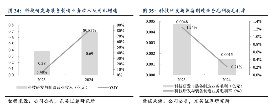 营业收入显著提升,成本投入较高、毛利率回落。2022年起,科技研发与装备制造业务营收持续上升,2024年达0.69亿元,同比增长80.83%。与此同时,因科研成本投入增加且回报周期长,科技研发与装备制造业务毛利及毛利率持续下降,2024年毛利0.0015亿元,毛利率0.21%。