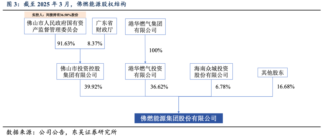 国资控股&燃气龙头持股,保障公司稳健发展。截至2025年3月,佛山国资委为公司实际控制人,通过佛山市投资控股集团有限公司间接持有佛燃能源36.58%的股份。港华燃气集团有限公司为第二大股东,间接持有佛燃能源36.62%的股份,通过资本注入、技术赋能、资源整合等多种方式与佛燃能源在气源采购、氢能项目等方面进行合作,助力佛燃能源从传统燃气企业向综合能源服务企业转型。员工持股平台海南众城投资股份有限公司持股6.78%,保障员工分红福利,充分调动积极性。