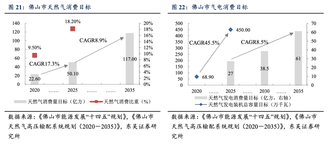 依照佛山市能源规划目标,2025-2035整体/气电天然气消费量复增8.9%/8.5%。根据《佛山市能源发展“十四五”规划》,2025年全市天然气消费量需达50.1亿方,相较2020年复合增长17.3%,同时计划天然气消费比重从2020年的9.5%提升至2025年的18.2%;根据《佛山市天然气高压输配系统规划(2020-2035)》,到2035 年佛山市天然气消费规模目标达到115~119 亿方/年,取中值117亿方进行计算,2025-2035年佛山市天然气消费量复合增速8.9%。根据《佛山市能源发展“十四五”规划》,2025年全市天然气发电装机总容量需达450万千瓦,相较2020年复合增长45.5%;根据《佛山市天然气高压输配系统规划(2020-2035)》,电厂消费规模在2025/2030/2035年分别达到22-32/33-44/61亿方,取中值进行计算,2025-2035年佛山市气电天然气消费量复合增速8.5%。佛山市将加快推进佛燃三水水都分布式能源站、华电顺德西部生态产业园分布式能源站二期等天然气发电电厂项目的建设,公司电厂用户气量需求将进入加速释放周期。