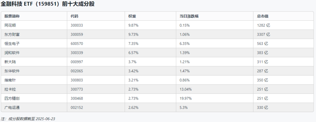 截至2025年6月23日收盘,华宝基金旗下的金融科技 ETF(代码:159851)表现强势,当日涨幅达 4.49%,成交额为 7.875 亿元,基金最新规模为 49.190 亿元,折溢价率为 0.11%。